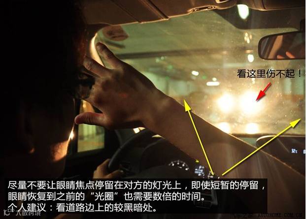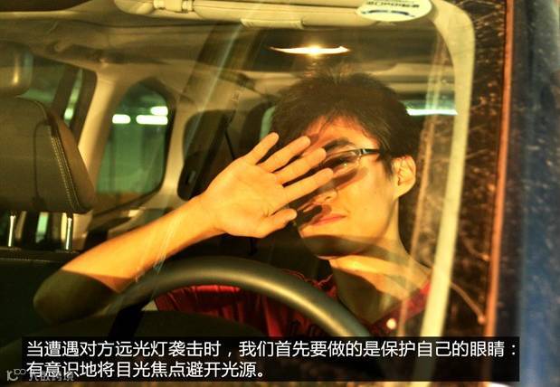 在发现前方车辆开车远光灯的时候,我们要尽可能躲开发光点,虽然也刺眼,但是能缓解一下恢复到黑暗后对于道路的观察。眼睛可以看前方道路右侧的边缘处,这样避免被晃到的同时还可以看到一些道路的情况。