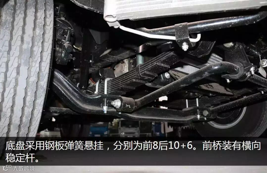 底盘方面,能看到依维柯超越前后桥均为非独立钢板弹簧悬架,前桥为8片钢板弹簧悬架,并装配了前桥稳定杆,不仅增加了车辆行驶的稳定性,同时增强了前桥的强度。后桥则采用10+6的钢板弹簧悬架,充分地保证了依维柯超越的装载能力。