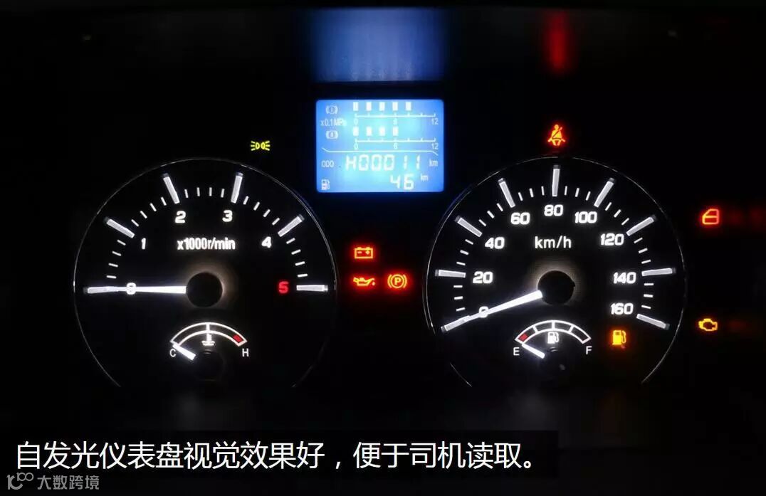 驾驶室内饰整体采用黑灰色,耐脏。方向盘为两幅造型,中间为喇叭按钮,并无多功能按钮。仪表盘采用双圆盘设计,自发光的仪表盘在夜间的视觉效果佳,便于司机的观察,储气罐气压值与里程则用液晶屏幕显示。