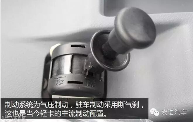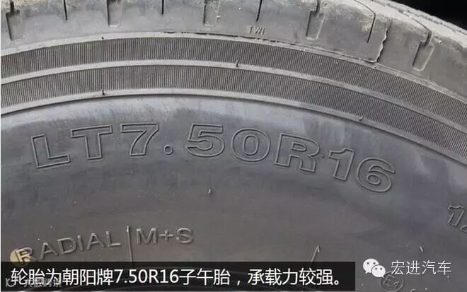 承载力方面,最大车货总重质量为4490kg。其中前轴1820kg,后轴2670kg。钢板弹簧片数为前7后8+8,轮胎为朝阳牌7.50R16子午胎,承载力较强。制动系统为气压制动,驻车制动采用断气刹,这也是当今轻卡的主流制动配置。