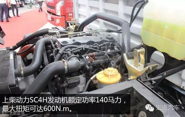 上柴动力SC4H电控国四发动机由上柴与英国里卡多公司联合开发。额定功率为140马力,最大扭矩可达600N.m,最大扭矩转速1200-1600rpm,全负荷最低燃油耗率为192g/kW.h。整车采用电控高压共轨技术+SCR达到国四排放标准,用户使用过程中需加注尿素。变速箱采用六挡变速箱。