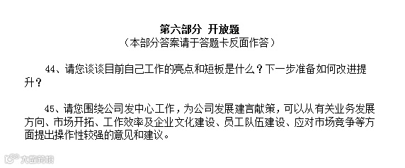 本次考试为闭卷考试,考查应试者从事工作所必须具备的能力,测试主要包括数量关系、判断推理、常识判断、言语理解与表达、资料分析、自我优劣势论述及为公司发展献言献策这七个方面。