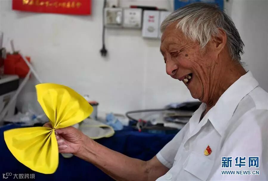 7月31日,叶连平在“留守未成年人之家”教室里欣赏学生刚刚送给自己的折纸礼物。92岁的退休教师叶连平生活在安徽省和县乌江镇卜陈村,村里的年轻人大多外出工作,留下的多是老人和孩子,家长普遍没有能力辅导孩子学习。2000年,原本是老师的叶连平决定创办“留守未成年人之家”,为孩子们免费补习英语。19年来,叶连平帮助过的孩子超过1000名。新华社记者刘军喜摄