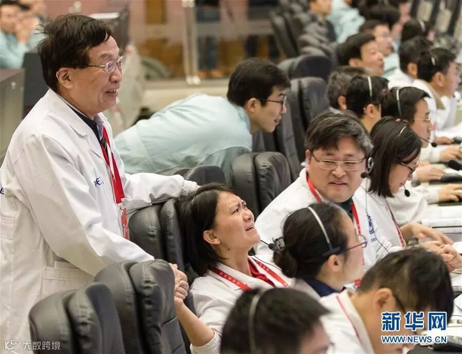 1月3日,嫦娥四号成功落月的那一刻,74岁的中国航天科技集团五院深空探测和空间科学首席科学家、嫦娥一号卫星总设计师叶培建院士(左一)静静走到嫦娥四号探测器项目执行总监张熇的身后,对她表示祝贺和鼓励。两代“嫦娥人”的手紧紧握在了一起。新华社记者金立旺摄