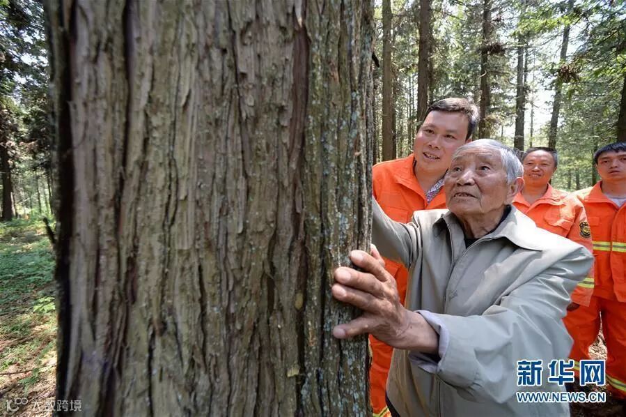 4月27日,在贵州省毕节市赫章县平山国有林场,李代关老人(前)在查看当年和同事种的杉树。今年88岁的李代关是贵州省毕节市赫章县平山国有林场的一名退休职工,他1958年参加工作,成为一名林业工人,把毕生奉献给了林业事业。在李代关的感召下,他的儿子和孙子都成为了护林员。经过几代林业工人的努力,截至2018年底,赫章县平山镇的森林覆盖率已达66.7%。新华社记者杨楹摄