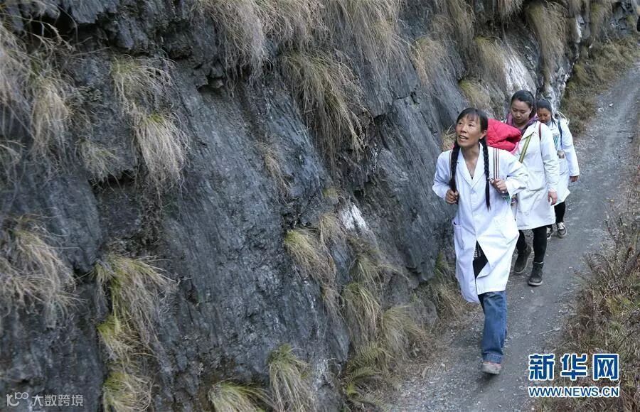 在云南怒江贡山县丙中洛镇,管延萍(左)与同事走在进村的山路上(1月13日摄)。2017年,管延萍自愿到深度贫困地区云南怒江傈僳族自治州参加医疗援助。近两年来,管延萍背着背篓,跋山涉水,爬冰卧雪,送医进山达300多次,散落在丙中洛高山峡谷间的46个村组,她整整走了四轮。新华社记者张加扬摄