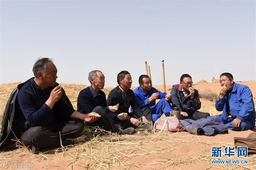 在甘肃省古浪县境内的黑岗沙风沙口,八步沙第二代治沙人贺中强(左一)、郭万刚(左二)、石银山(左三)、罗兴全(右三)、程生学(右二)、王志鹏(右一)在休息间隙吃午饭(3月26日摄)。二十世纪八十年代,八步沙是腾格里沙漠南缘甘肃省古浪县最大的风沙口。当地六位年龄加在一起近300岁的老汉,在承包沙漠的合同书上按下手印,誓用白发换绿洲。38年过去,六老汉只剩两位在世。