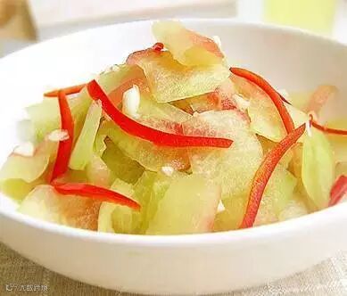 适量的西瓜皮削去外皮,洗净后切块放入锅中蒸10分钟即可。早、晚蘸白糖食用,具有解热止渴、利尿、降血压的功效。