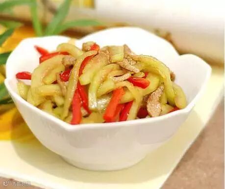 3.余油再次烧热,倒入挤干水份的西皮翻炒,加入切好的红椒丝。