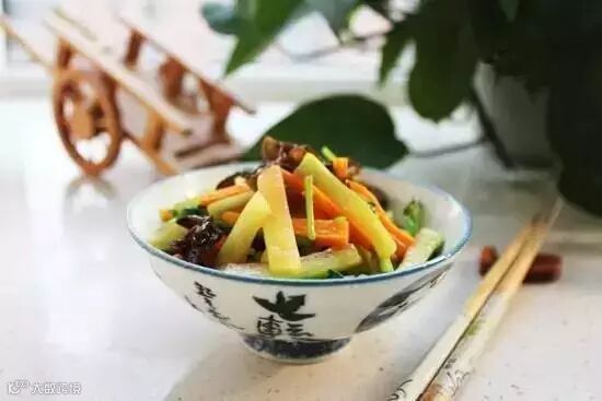 5.锅中先下胡萝卜丝翻炒,然后放木耳丝炒匀,放西瓜皮丝炒匀以后,加少许鸡汁,放适量盐调味