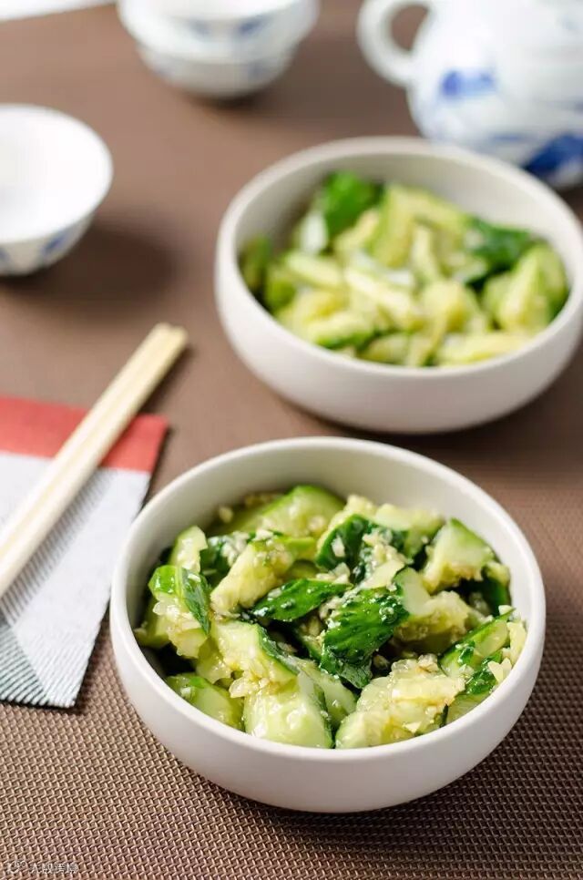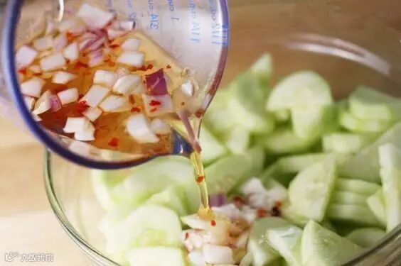 2.拍好黄瓜,将蒜蓉和干辣椒做的料和酱汁一起浇在黄瓜上,静置3分钟后就能开吃啦!