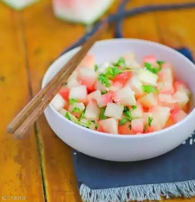 西瓜皮、蒜末、盐、鸡精、醋、香油、辣椒酱、香菜