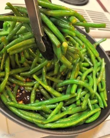 3.将豆角放入酱汁中,加入蒜碎和芝麻拌匀。