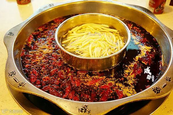 一行六人,要了一个鸳鸯锅,不是经常吃的太极鸳鸯锅,是子母锅。这个锅底看着就红辣辣的,飘着一层的红尖椒、花椒。