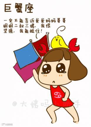 巨蟹座寡言少语,但大多很有思想和内涵;不喜欢喧闹的场合;心里常有一种一鸣惊人的欲望,而通常他们具备这个能力;高傲和自卑这两种性格在巨蟹座身上体现得特别明显;巨蟹座对吃的要求很高;巨蟹座很重浪漫情怀,感情细腻激烈,他们一旦陷入爱情会全身心投入愿为爱人赴汤蹈火。