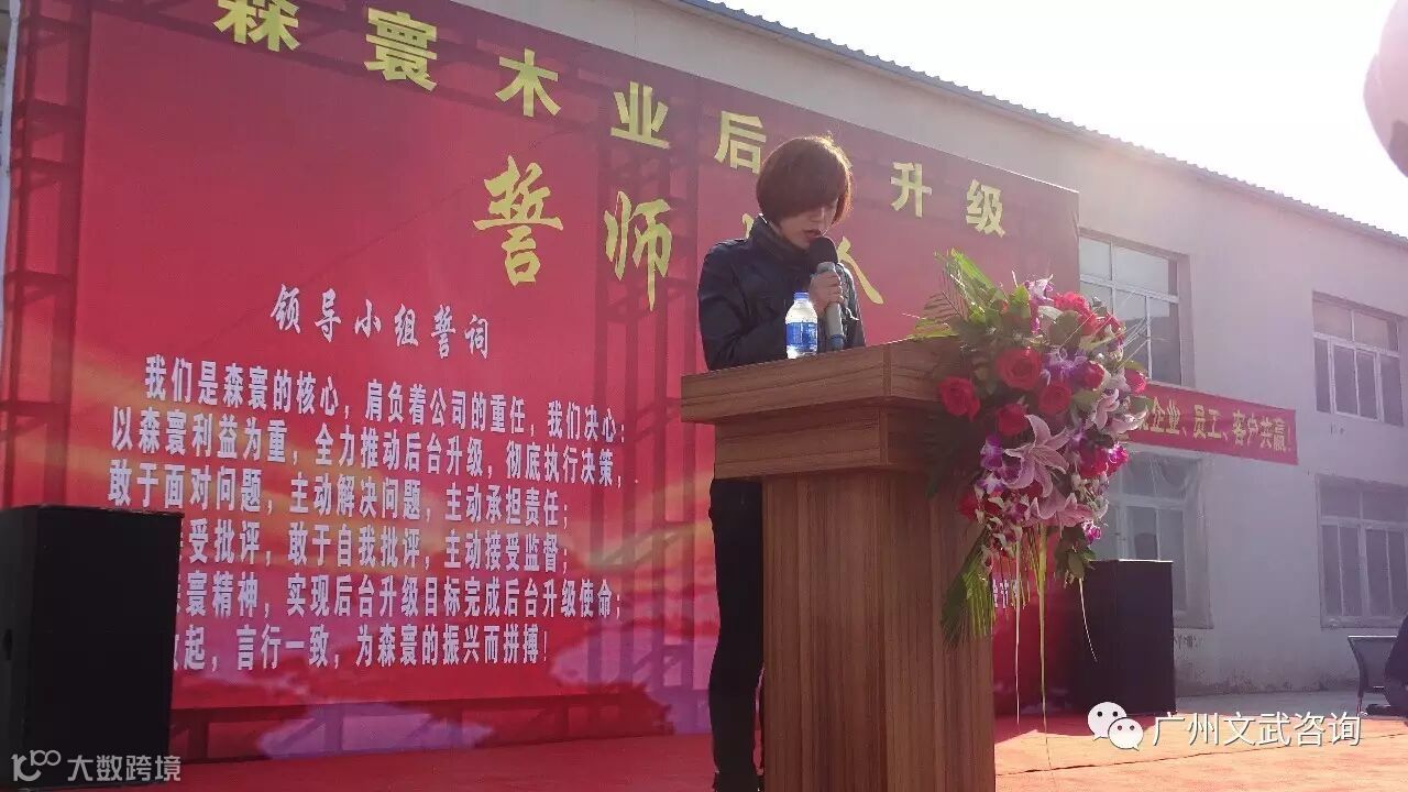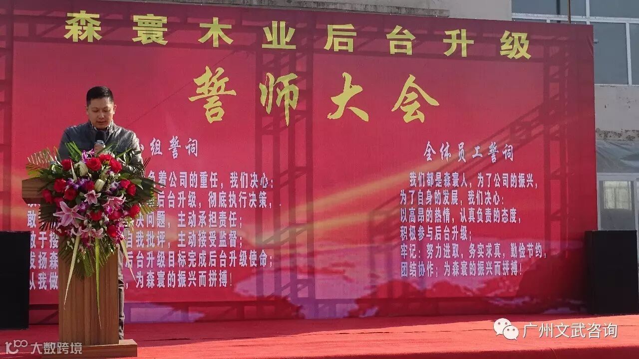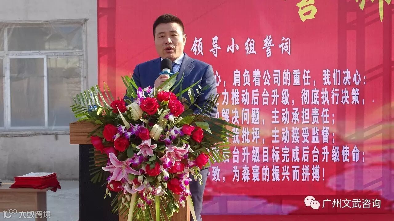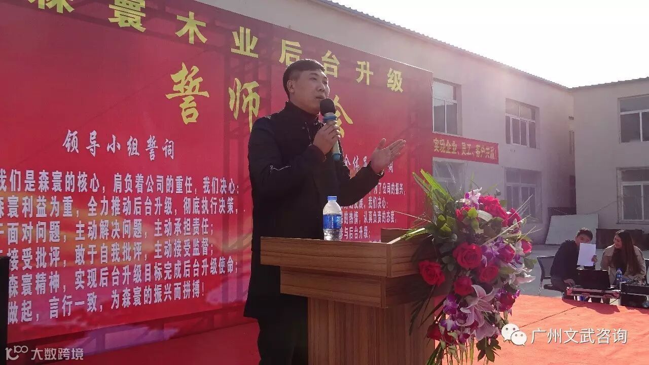 士气展示完毕,森寰木业总经理王振波先生发表了热情洋溢的致辞。他表示很高兴在这美好的日子里,大家欢聚一堂,隆重举办森寰木业后台升级誓师大会,并感谢文武咨询带来此次合作,很期盼此次合作能够顺利进行并取得良好效果。