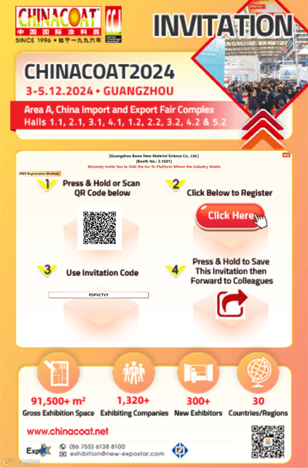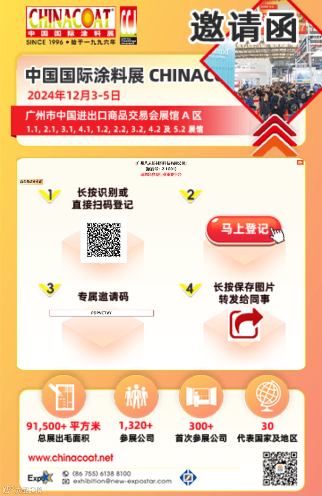 您好!广州八禾新材料科技有限公司将参加2024年12月3日至12月5日在广州中国进出口商品交易会展馆A区举行的2024「中国国际涂料展 CHINACOAT」/「中国国际表面处理展 SFCHINA」。我们诚挚邀请您莅临我们的展位,展位号:2.1G01,衷心感谢您的支持和指导!