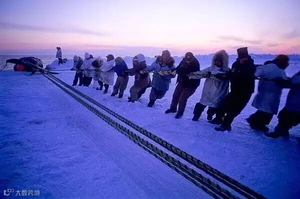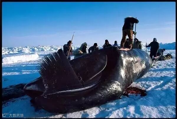 爱斯基摩人把鲸鱼拉上岸,先祷告,再肢解鲸鱼。