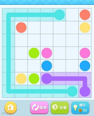 连连线大师是一款休闲益智小游戏,玩家需要将给出的方格内相同颜色的圆点连接在一起,线路必须覆盖所有空格,并且每个空格经过的线路不能重复,完成所有连线即可过关。