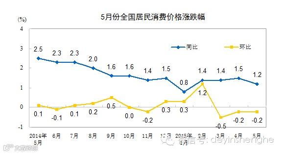 据国家统计局,中国5月CPI同比增1.2%,彭博调查的预期为增长1.3%,前值增长1.5%。5月PPI同比下降4.6%,彭博调查的预期为下降4.5%,前值下降4.6%。