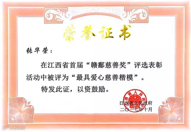 表彰大会上,华坚集团董事长张华荣先生因在公益慈善领域做出的突出贡献,获得“江西省首届赣鄱慈善奖最具爱心慈善楷模”奖项。