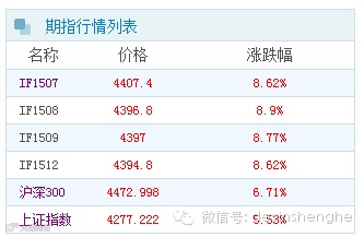 沪深300指数期货大涨,主力合约IF1507涨8.62%,1508、1509、1512涨幅逼近9%。