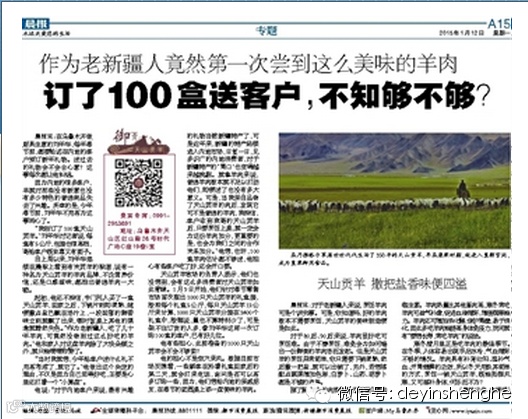 因为,他已经做出了决定,“我刚订了100盒(每盒5公斤)天山贡羊”。自上周以来,他连续在本报上看到,有一种名为天山贡羊的羊肉品牌,不论营养价值,还是口感滋味,都胜出普通羊肉一大截。