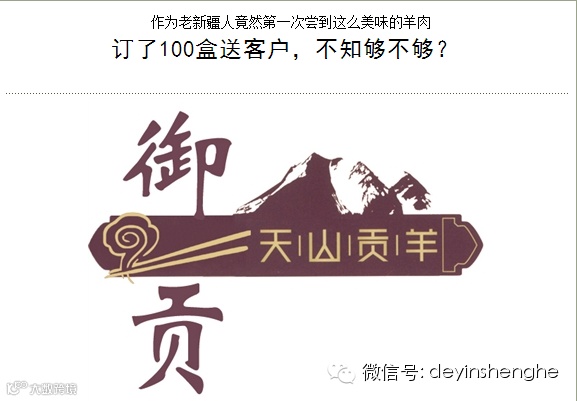他说,“对于内地客户来说,最有兴趣的礼物当属新疆特产了,可是近年来,新疆的特产陆续进入内地市场,日复一日,见多而识广的内地消费者,对于新疆特产的‘胃口’也变得越来越挑剔。就拿羊肉来说,普通羊肉根本就不足以打动他们,即便送了也没有多大意义。可是,根据我自己吃过而知味的理解,天山贡羊可不是普通羊肉,我相信,客户收到这盒羊肉后,只要烹饪上桌,就一定会为这份羊肉加分,更重要的是,也会为我们之间的合作关系加分”。他想,也许,100盒羊肉估计都不够送。