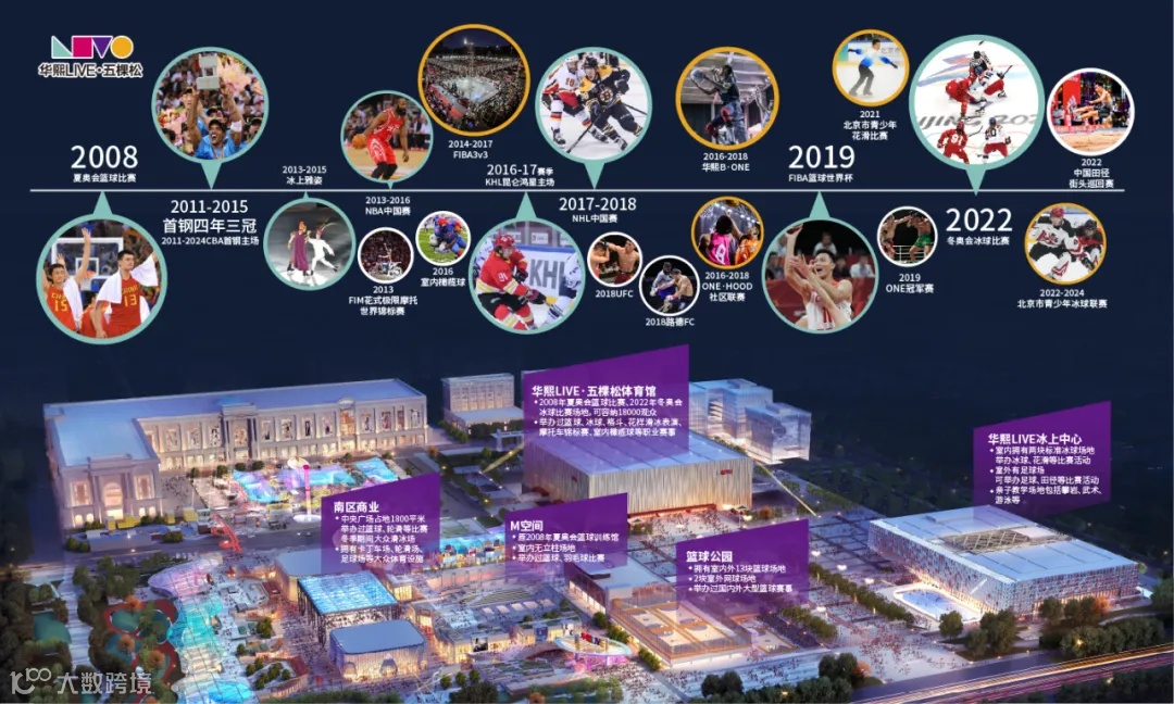 华熙LIVE·五棵松占地28万平方米,包括四座体育馆(2008年北京奥运会篮球和2022年北京冬奥会冰球比赛馆——五棵松体育馆、2008年北京奥运会篮球训练馆M空间、2022年北京冬奥会冰球训练馆——华熙LIVE冰上中心和篮球主题公园HI-PARK)、一片配套商业和三栋写字楼,是北京极具特色的商圈。
