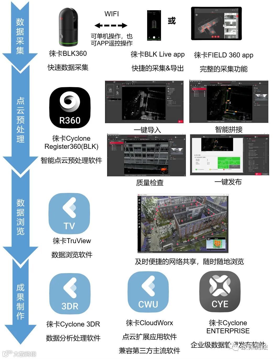 简单、高效、专业的徕卡BLK360三维激光扫描解决方案是由徕卡BLK360和功能强大的软件组成。徕卡BLK360扫描获得的点云数据直接导入到徕卡Cyclone Register 360(BLK)软件中,实现一键导入、智能拼接、质量检查、一键发布;并可通过功能强大的徕卡Cyclone系列软件轻松应对海量点云的数据处理,提高处理效率。