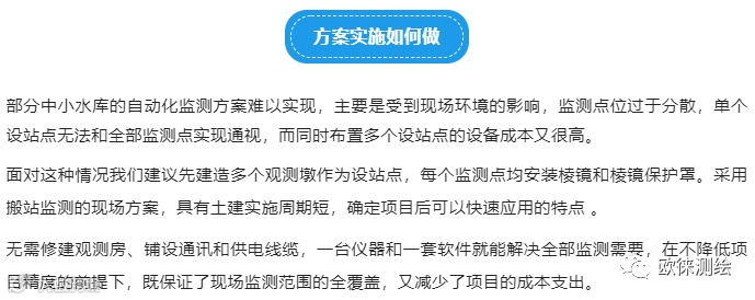 欧徕测绘随着近年来水利行业自动化监测项目的增多,很多中小水库坝体、边坡的监测需求也日渐增加。部分中小水库因为预算有限和现场环境的影响,无法满足全自动方案的实施条件,仍然沿用传统的人工监测方案,不仅费时费力还有诸多安全隐患。