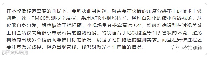 徕卡地铁自动化监测方案通过徕卡GeoMoS监测软件配合徕卡TM60监测型全站仪,从监测现场实施和监测平台设置两个方向进行优化,硬件、软件“双管齐下“,在不降低监测棱镜密度的前提下,减少误报的可能。同时保证监测数据的真实可靠,预警的及时有效。