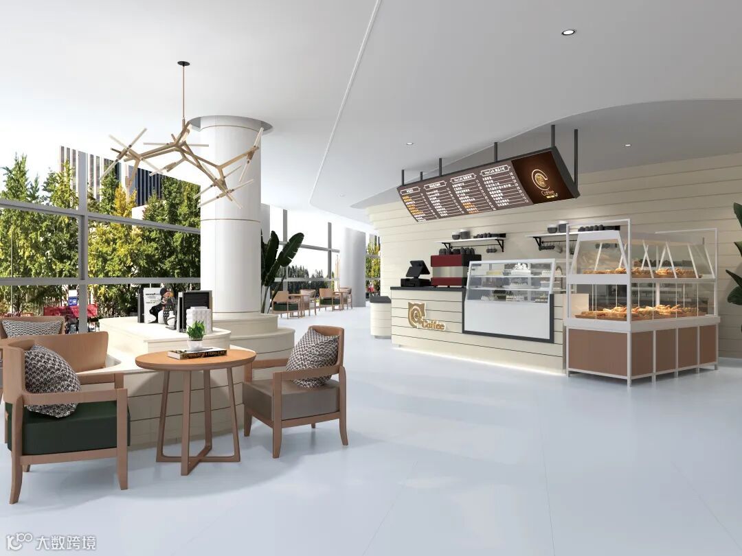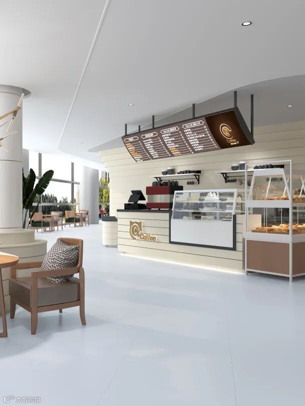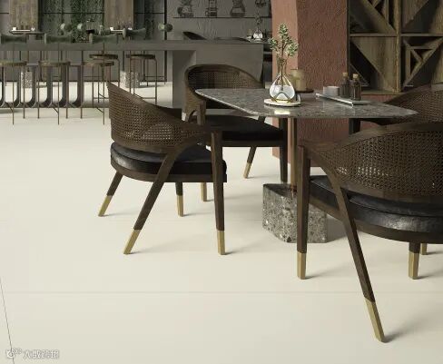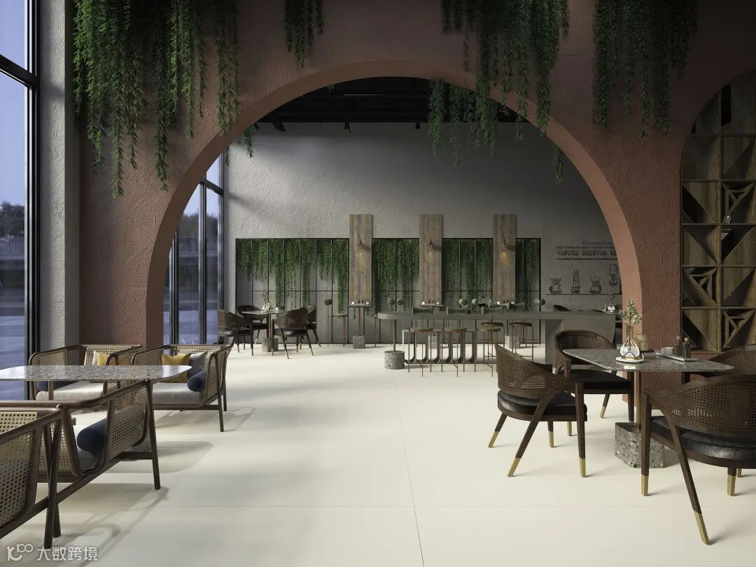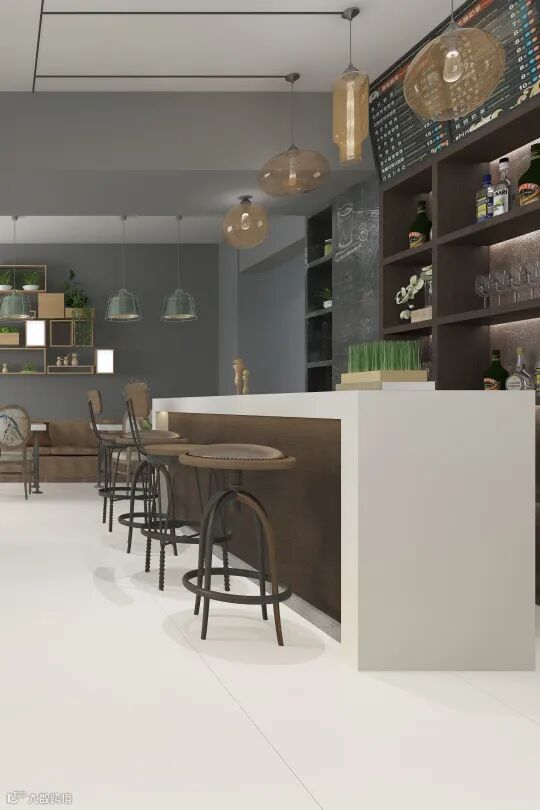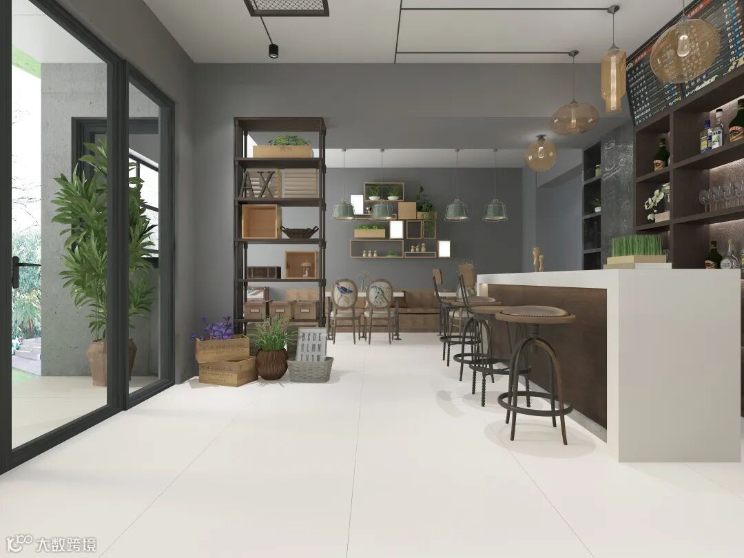 在商业空间的应用参考中,极为淡雅的【莫奈灰】【茉莉白】,大面积通铺地面,化身为完美的空间底色,与设计感十足却容易产生堆积感的吧台、桌椅协调搭配,为整个空间带来更丰富的层次感和立体感。