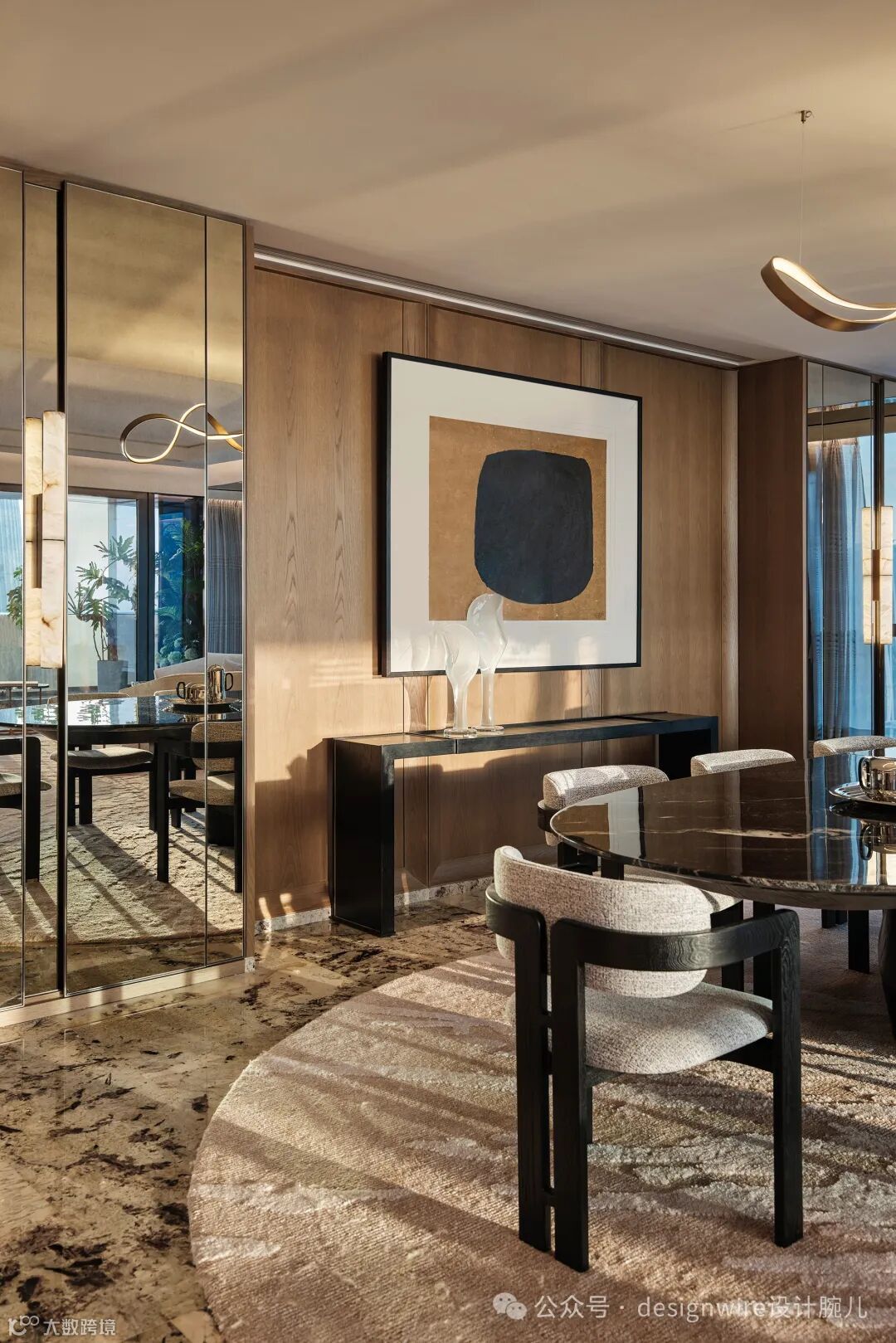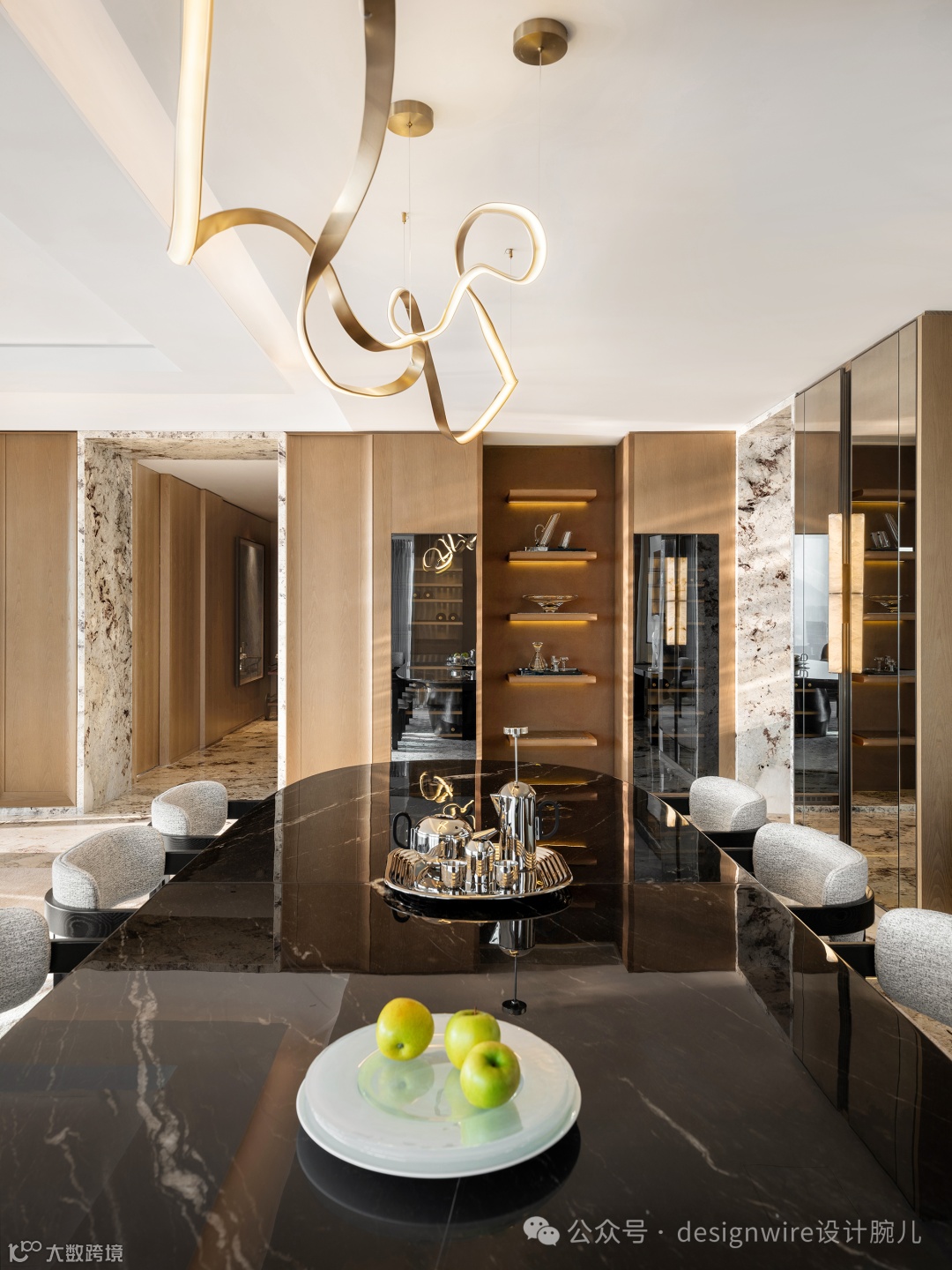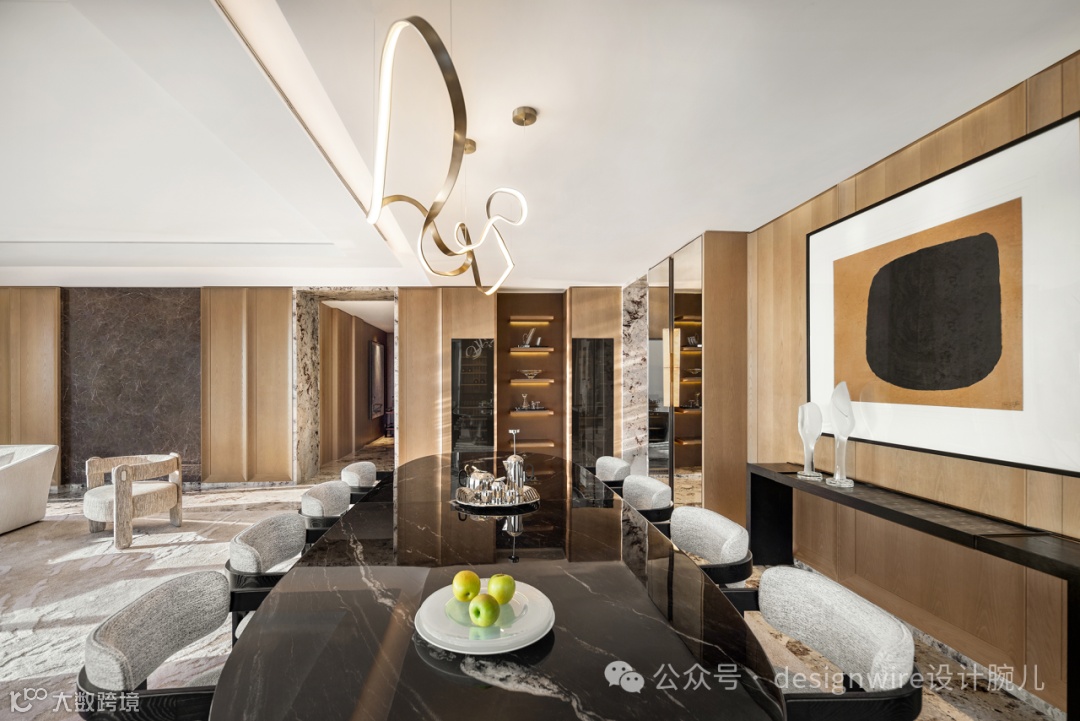 ◉餐厅用餐区|巴西潘多拉石材被大面积使用在地面,土耳其奥斯曼灰置于墙面与之映衬,形成一种流动艺术中的沉稳奢华。