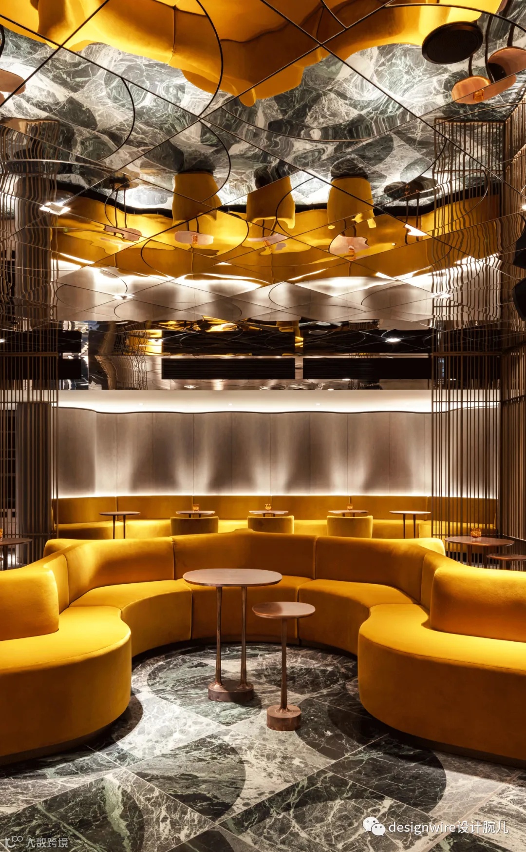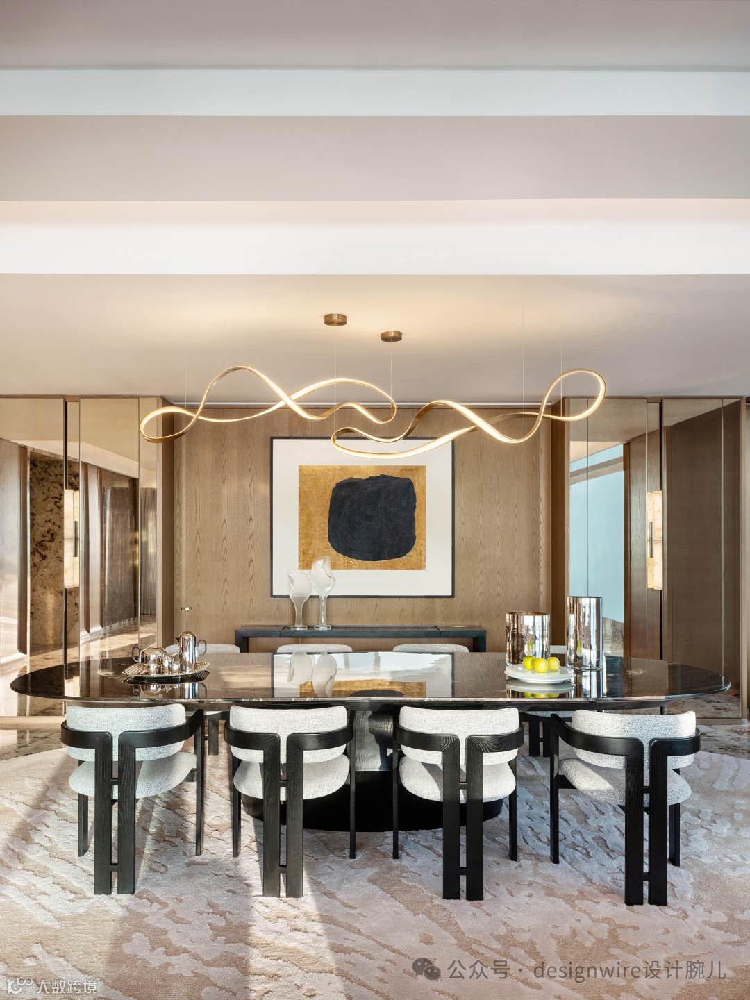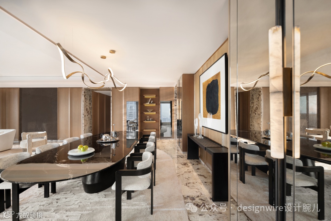 ◉餐厅用餐区|巴西潘多拉石材被大面积使用在地面,土耳其奥斯曼灰置于墙面与之映衬,形成一种流动艺术中的沉稳奢华。