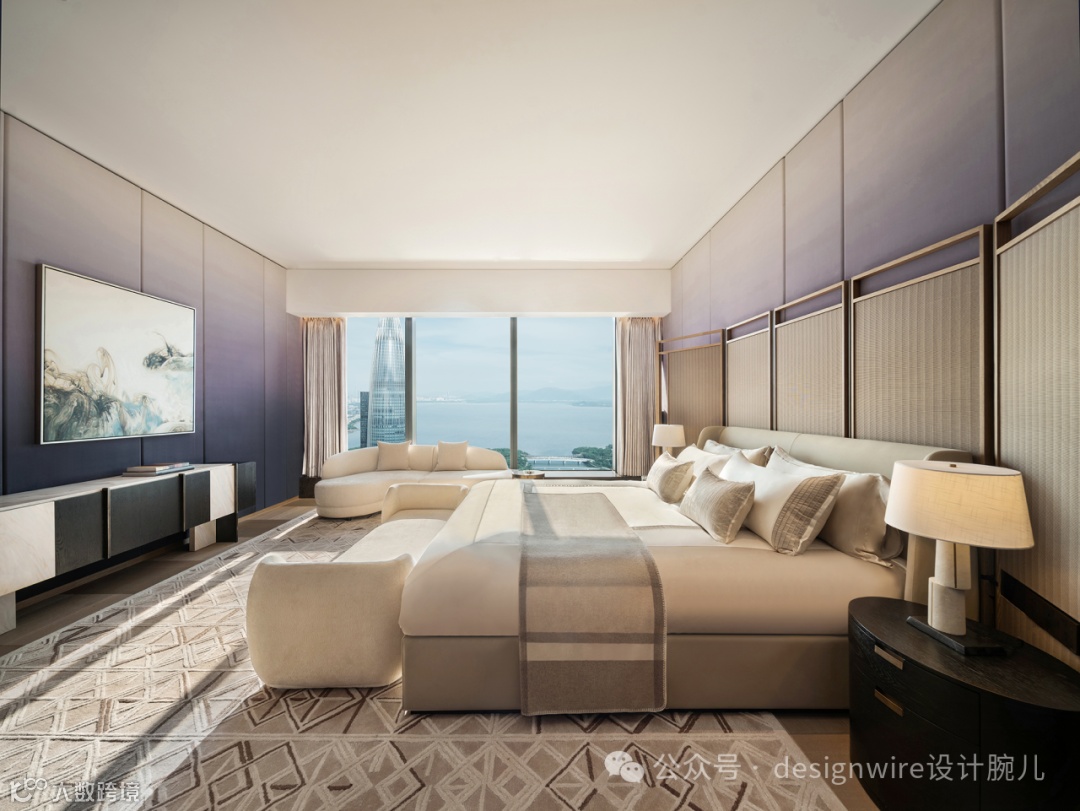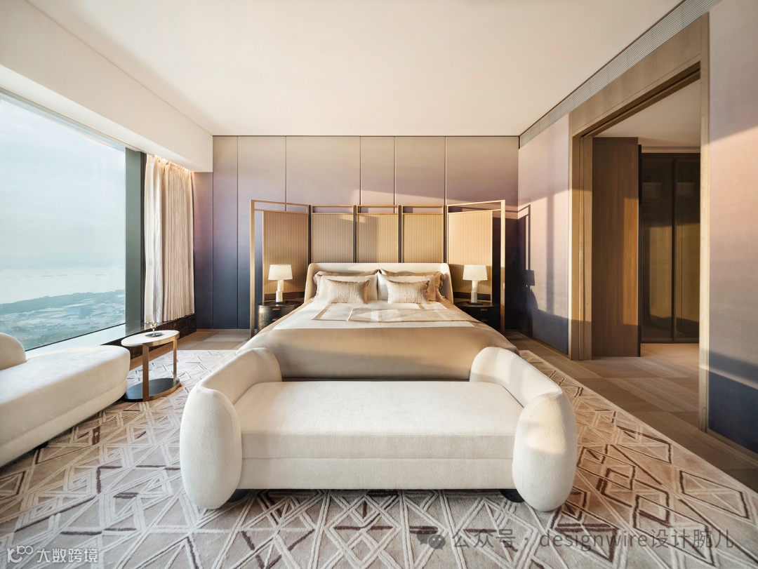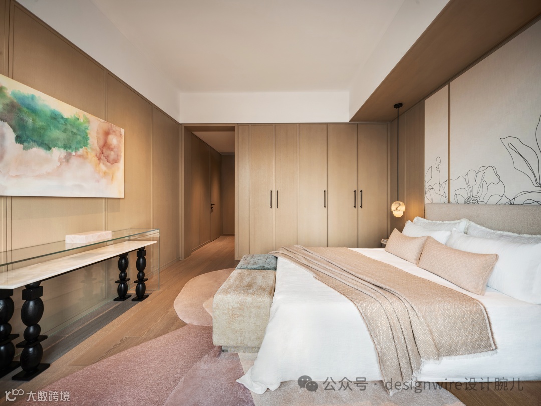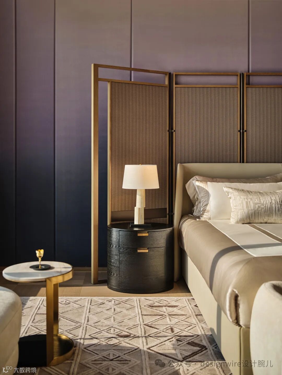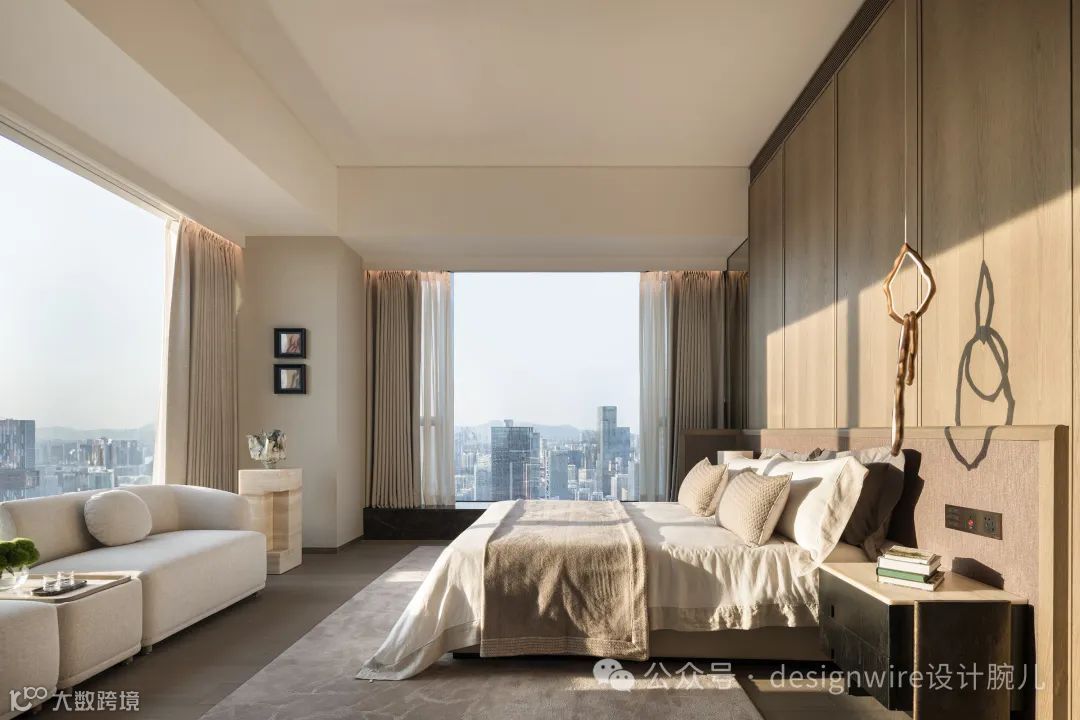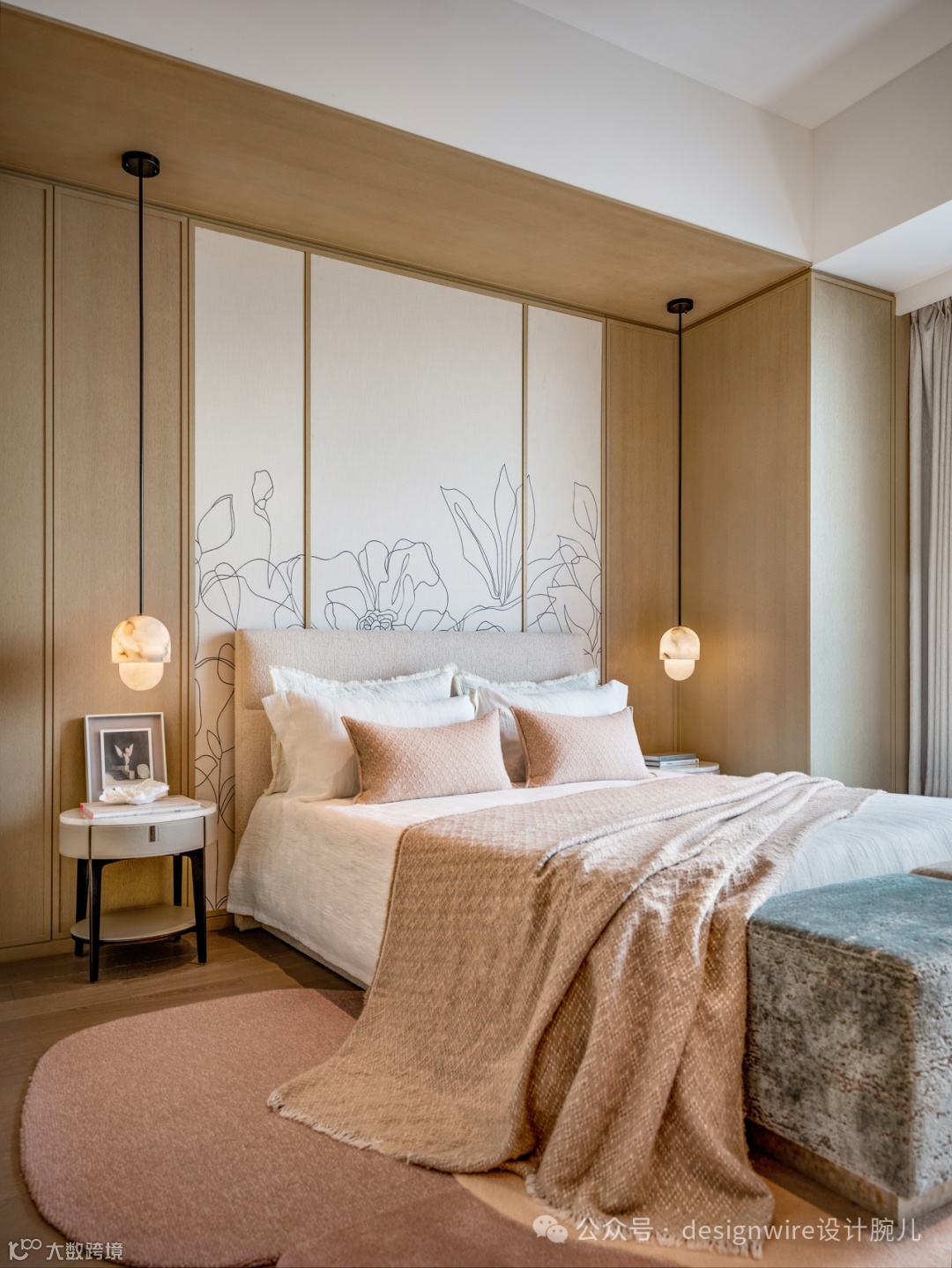 进入卧室,主卧墙面全部镶嵌壁布,人与景结合,日出日落,一弦一柱,仿佛时间在此刻凝固。