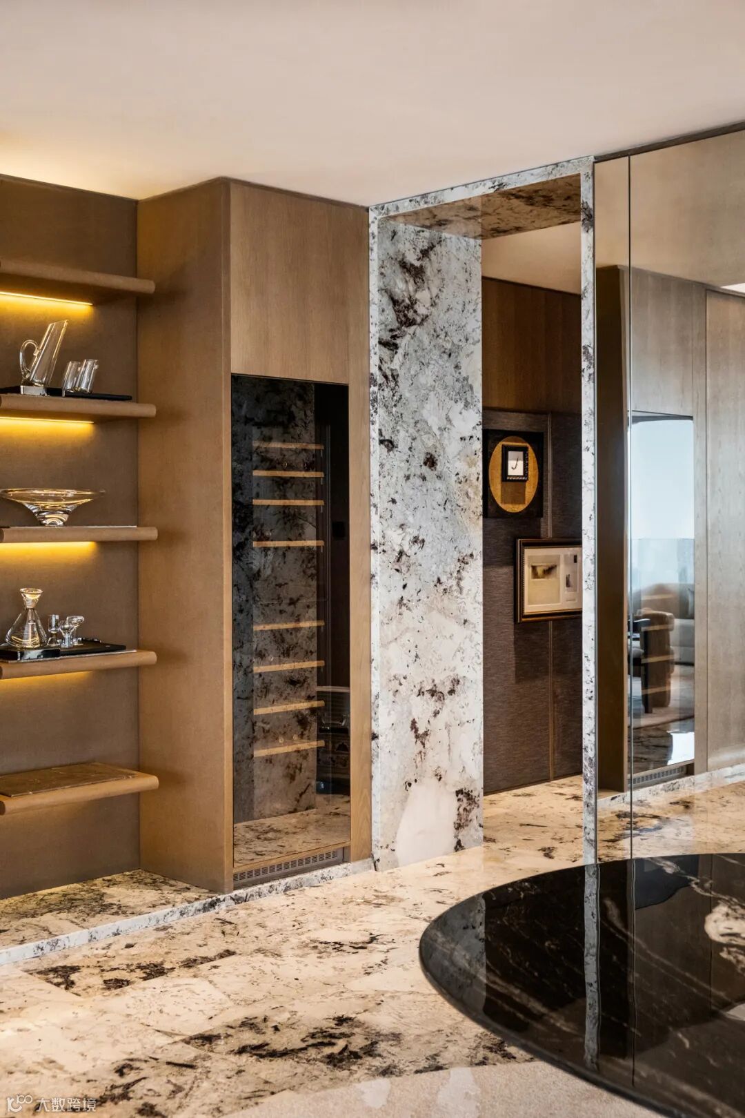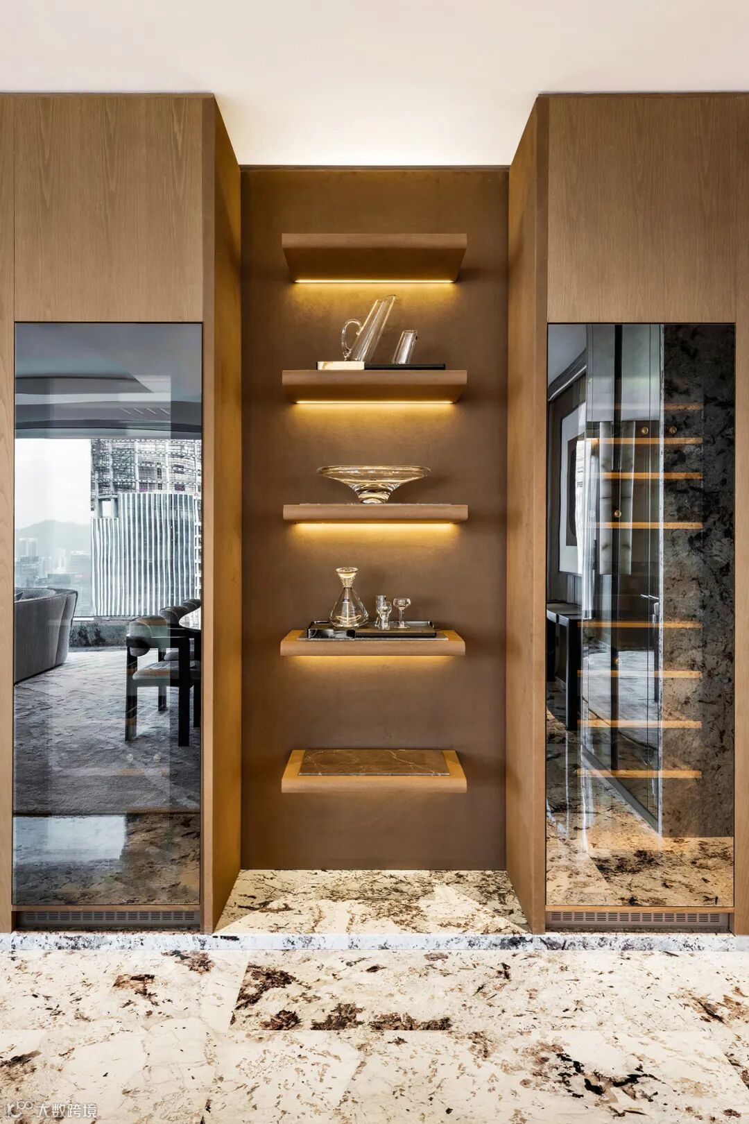 ◉ 瑞族V-ZUG无边框酒柜在客餐厅中引人注目,充当私人藏酒室的同时,出色的灯光设计和酒架,尽显格调,摆设架可以充分地在柜中展示品味。