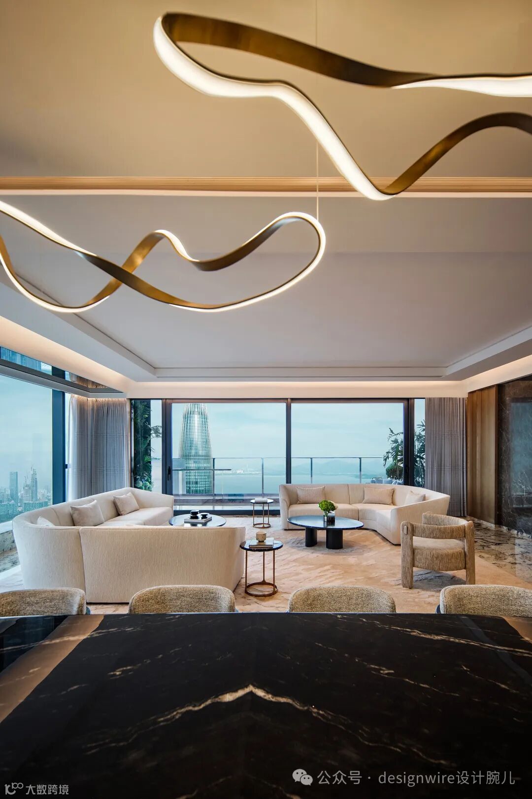 ◉阳台视野|自然是绕不开的主题,弧形沙发围绕着天花而成,彰显一体化的设计,采用比利时进口的专属特制面料,不失独特与品味。