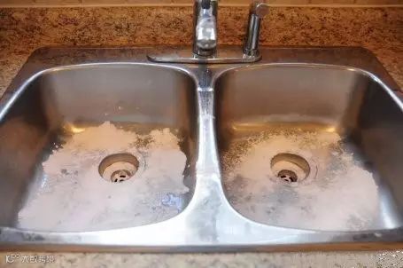 把小苏打粉均匀地倒在水槽和排水孔的四周,静置几分钟~