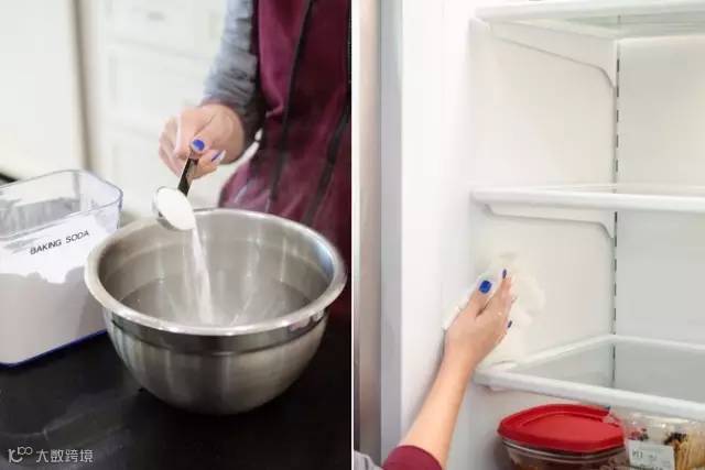 有香味的肥皂和其他清洁剂清洗冰箱可能会影响食物的口味,相反,用小苏打粉和热水擦洗冰箱就不用担心这个问题啦~