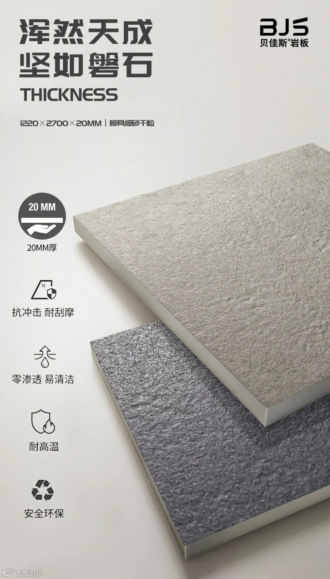 贝佳斯岩板1220×2700×20MM——7款超厚岩板,结合模具细砂干粒和哑面工艺,7级莫氏硬度,切割不易断裂,拥有超强的耐酸碱、耐高温、抗冲击、零渗透、零甲醛等性能,是专为台面而生的健康板材。