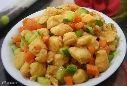 7、锅中放油,倒入胡萝卜丁炒至变色