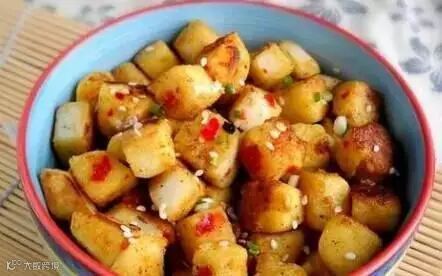 4、炒锅上火,倒少许烧热,下馒头丁翻炒至微黄。