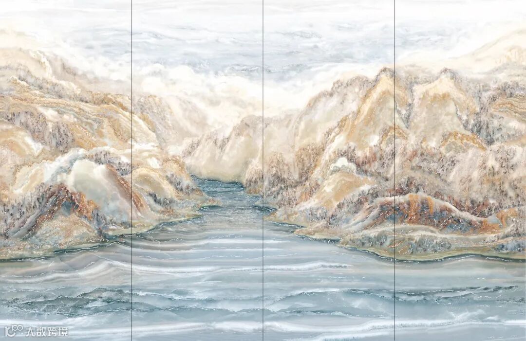 百川归海以苍劲有力的笔法描绘着山峰的秀雅,形成一幅层峦叠嶂、群山连绵的画卷,将山河的磅礴气势引入家居空间,表面排布着如电光般流畅而闪耀的纹路,勾勒出耐人寻味的幽深意境。