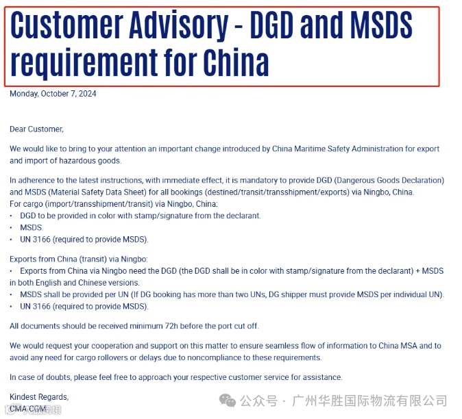 达飞(CMA CGM)于10月7日发布一份客户公告,提醒客户注意中国海事局对危险品进出口出台的一项重要变化。