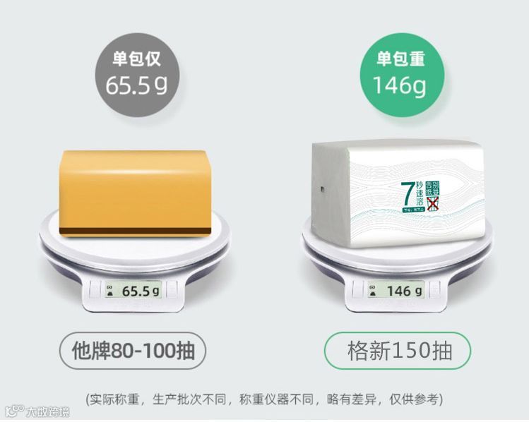 你再拿两包纸巾仔细对比,在包装袋的角落里就能找到答案。¥2.00那个有可能是100抽/包的一等品,¥3.00是150抽/包的优等品。