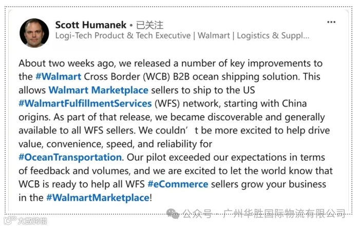 近日,沃尔玛相关负责人Scott Humanek在社交媒体透露:大约两周前,沃尔玛对WCB B2B海运解决方案进行了一些关键改进,这使得沃尔玛市场的卖家可以直接通过沃尔玛的跨境海运解决方案,将中国制造的商品运送到沃尔玛的美国配送中心网络。