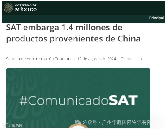 广州华胜国际物流有限公司日前,墨西哥税务管理局(SAT)发布公告,2024年7月,对来自中国的超过140万件货物进行了预防性扣押,其价值约为4.18亿比索。