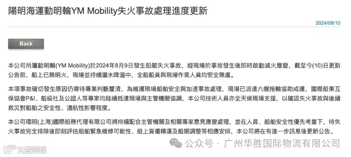 8月10日,阳明海运发布公告,对“YM Mobility”爆炸事故处理进度进行了更新说明: