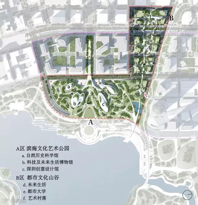 △广场分为“滨水文化艺术公园”和“都市文化山谷”